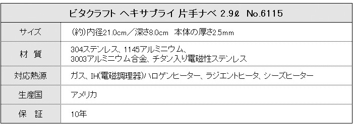 ビタクラフト ヘキサプライ 片手ナベ 2.9L 全面6層構造でさらに熱しやすく冷めにくいので、煮物に最適。 [6115]