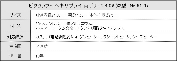 ビタクラフト ヘキサプライ 両手ナベ 4.0L 深型 おでん、ポトフなど大量に作る料理にうってつけのお鍋です。 [6125]