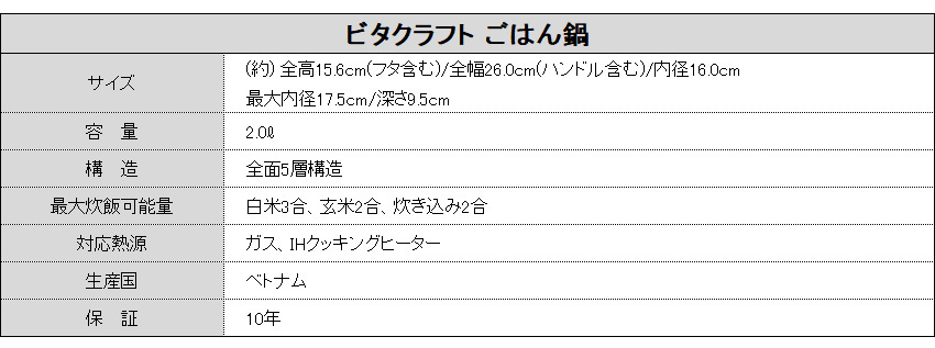 ビタクラフト ごはん鍋 フタも本体も完全5層構造 -ごはん炊きのための鍋-お鍋で炊いたふっくらごはん♪