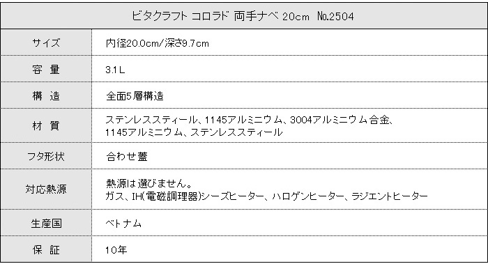 ビタクラフト コロラド 両手ナベ20cm 煮物・ポトフ・カレーなど煮込み料理にうってつけの一台。 [2504]