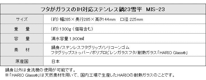 HARIO(ハリオ)フタがガラスのIH対応ステンレス鍋23雪平 お鍋、ポトフ、煮物などいろいろできる万能雪平鍋 [MIS-23]