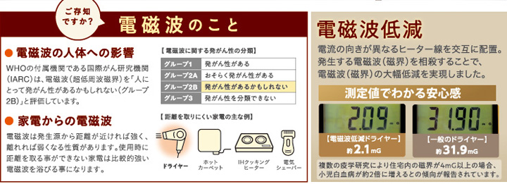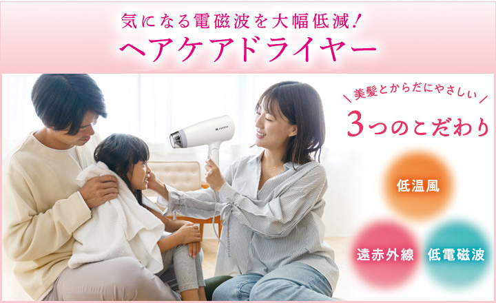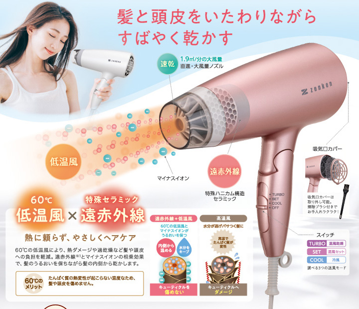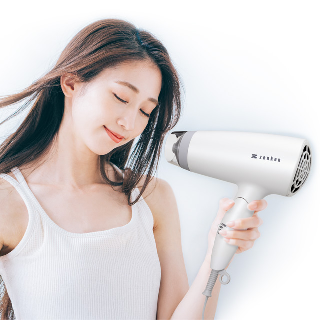 ゼンケン電磁波低減ヘアケアドライヤー 電磁波を大幅低減し、髪と頭皮をいたわりながら素早く乾かします。