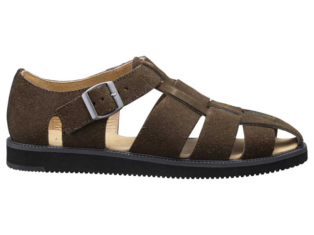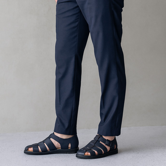 存在感のある厚手アッパー素材に軽量EVAソールを組み合わせたグルカサンダル。美錠裏にはゴムを配し脱ぎ履きも容易な仕様。