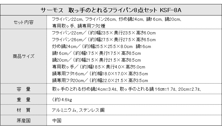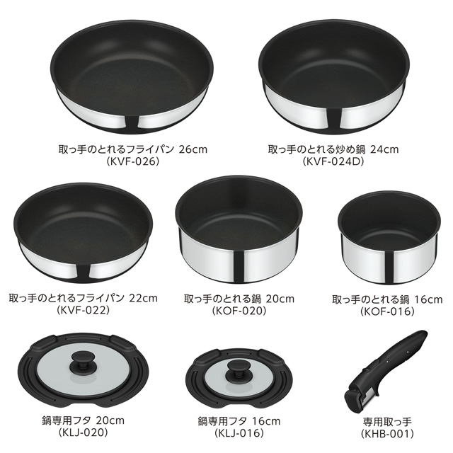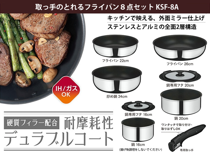 サーモス デュラブルシリーズ 取っ手のとれるフライパン8点セット IH・ガス火両方OK!ステンレスとアルミの全面2層構造で、外面ミラー仕上げでキッチンで映えること間違いなし♪ [KSF-8A]